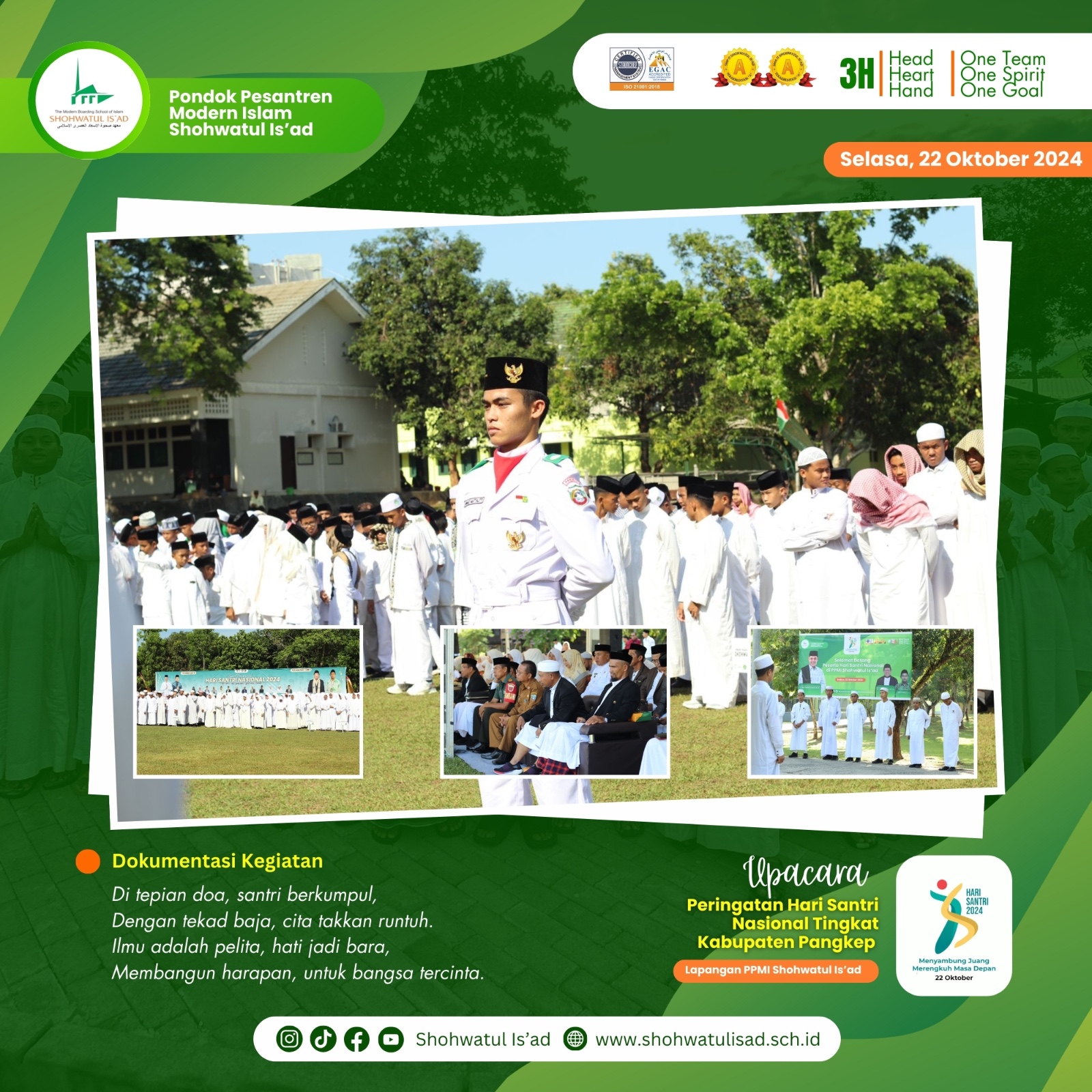Pangkep, 22/10/2024, Hari Santri Nasional tahun 2024 tingkat Kabupaten Pangkep diselenggarakan di Pondok Pesantren Modern Islam Shohwatul Is’ad, Padanglampe, pada Selasa (22/10/24). Acara ini dipimpin oleh Pjs Bupati Pangkep, Syahban Sammana, dan dihadiri oleh Kakan Kemenag Pangkep, Muhammad Nurhalik, serta para pimpinan dan pengasuh pondok pesantren. Ratusan santri dari 12 pesantren juga turut hadir meramaikan peringatan ini.
