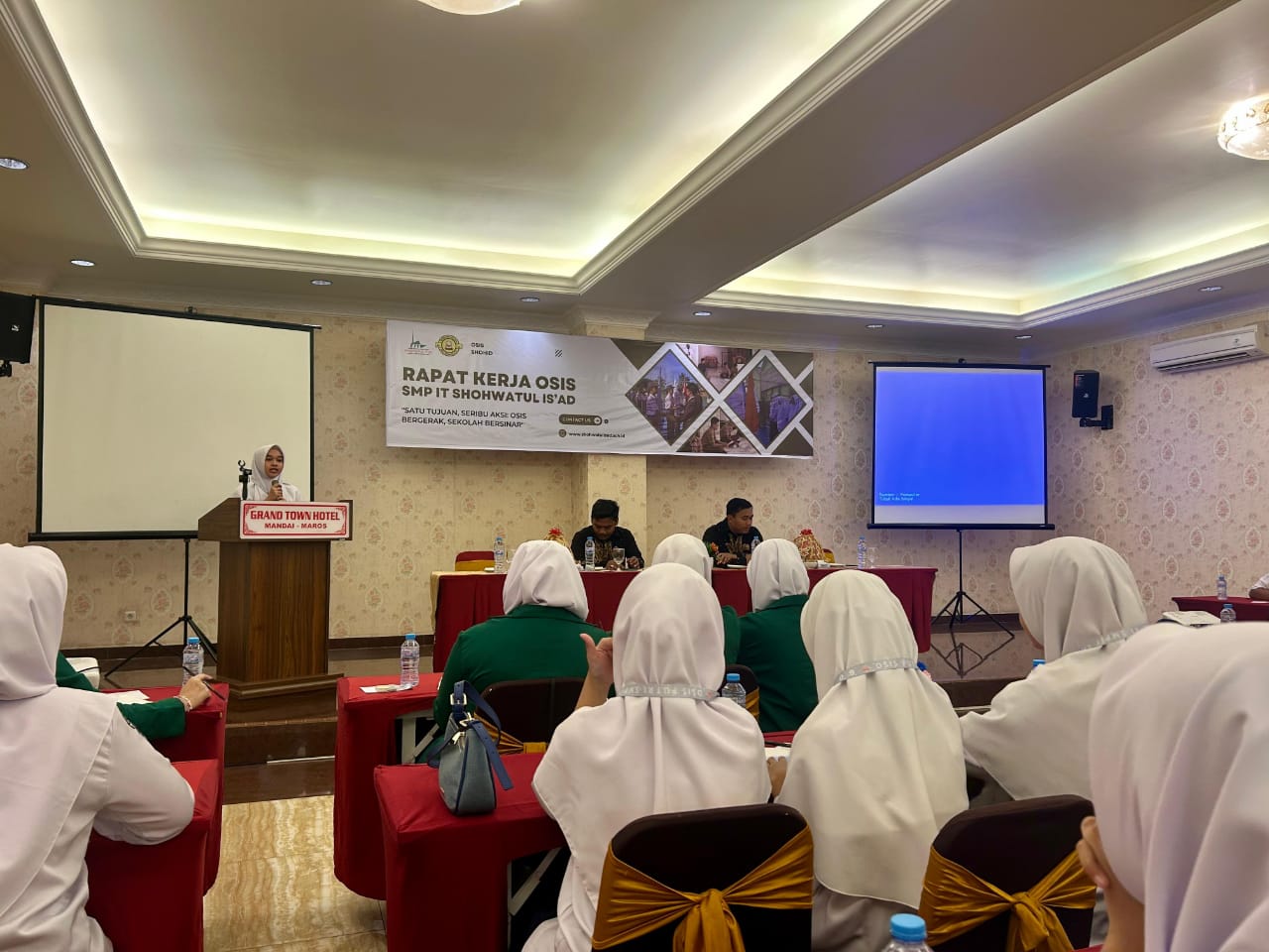 Maros, 28 Juli 2025 OSIS SMP IT Shohwatul Is’ad menggelar Rapat Kerja (Raker) yang penuh semangat dan inspirasi di Grand Town Hotel Maros, Senin (28/7). Kegiatan ini diikuti oleh seluruh santri yang tergabung dalam kepengurusan OSIS, didampingi langsung oleh Kepala Sekolah Ustadz Ahmad Sochabat, S.Pd., Gr., M.Pd., Wakil Kepala Sekolah bidang Kesiswaan, Pembina OSIS, serta para pendamping.