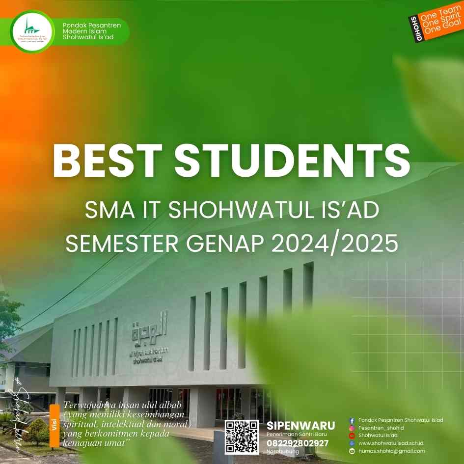 SMA IT Shohwatul Is’ad melaksanakan Pengumuman Best Students Semester Genap Tahun Ajaran 2024/2025 pada Senin, 11 Agustus 2025 setelah apel pagi. Agenda rutin setiap akhir semester ini menjadi sarana apresiasi kepada santri yang menorehkan pencapaian terbaik pada empat kategori utama: Best Academic, Best Character, Best Sport, dan Best Art. Penyerahan sertifikat dan reward diberikan langsung oleh Dewan Kiyai, Ustadz Ramly Bakka, Lc.