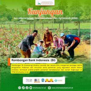 PPMI Shohwatul Is’ad, 22 April 2024 – Tim Bank Indonesia melakukan kunjungan lapangan ke PPMI Shohwatul Is’ad dengan fokus pada tinjau lokasi green house, pengolahan makanan dan kebun produksi termasuk lokasi pembuatan green house. Rombongan mengamati secara langsung proses pengolahan makanan tradisional dan modern di dalam pondok, serta praktik-praktik pertanian berkelanjutan yang diterapkan dalam kebun produksi pondok.